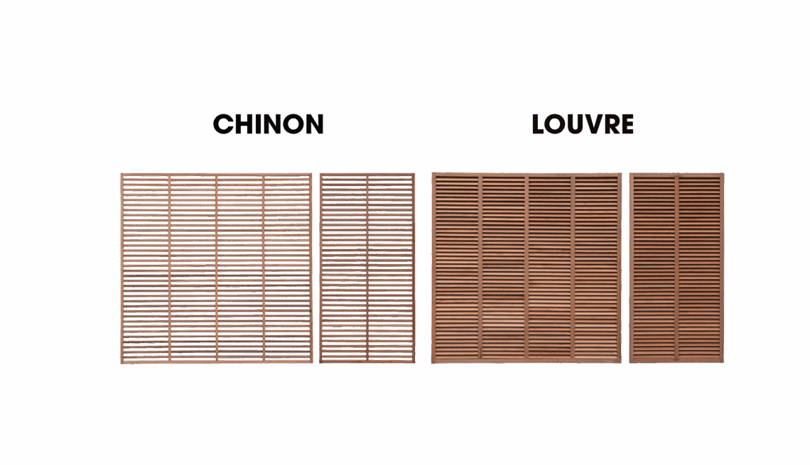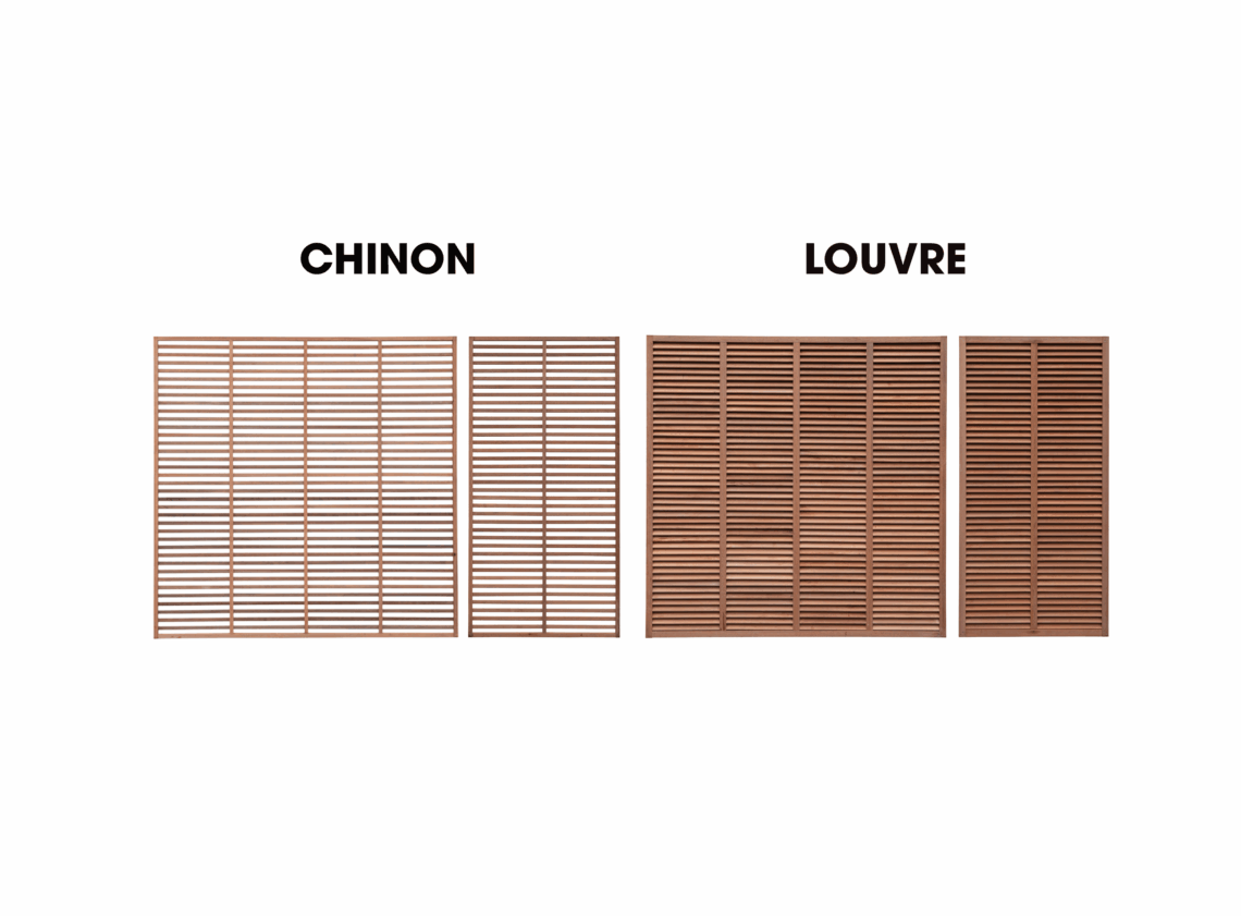 De CHINON trellissen bieden verduisterende decoratieve opengewerkte panelen terwijl het licht doorlaat. Compatibel met de panelen van de TRADITION-collectie.