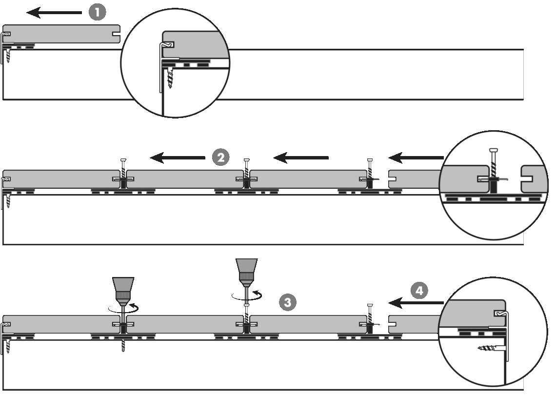 Schroef de clips vast, waarbij de planken aan beide zijden tegen elkaar moeten aansluiten om een nauwkeurige installatie te verzekeren. Het gebruik van schroefklemmen wordt aanbevolen. Het vereenvoudigt en optimaliseert het proces en maakt het mogelijk om meerdere rijen planken snel en nauwkeurig vast te schroeven.